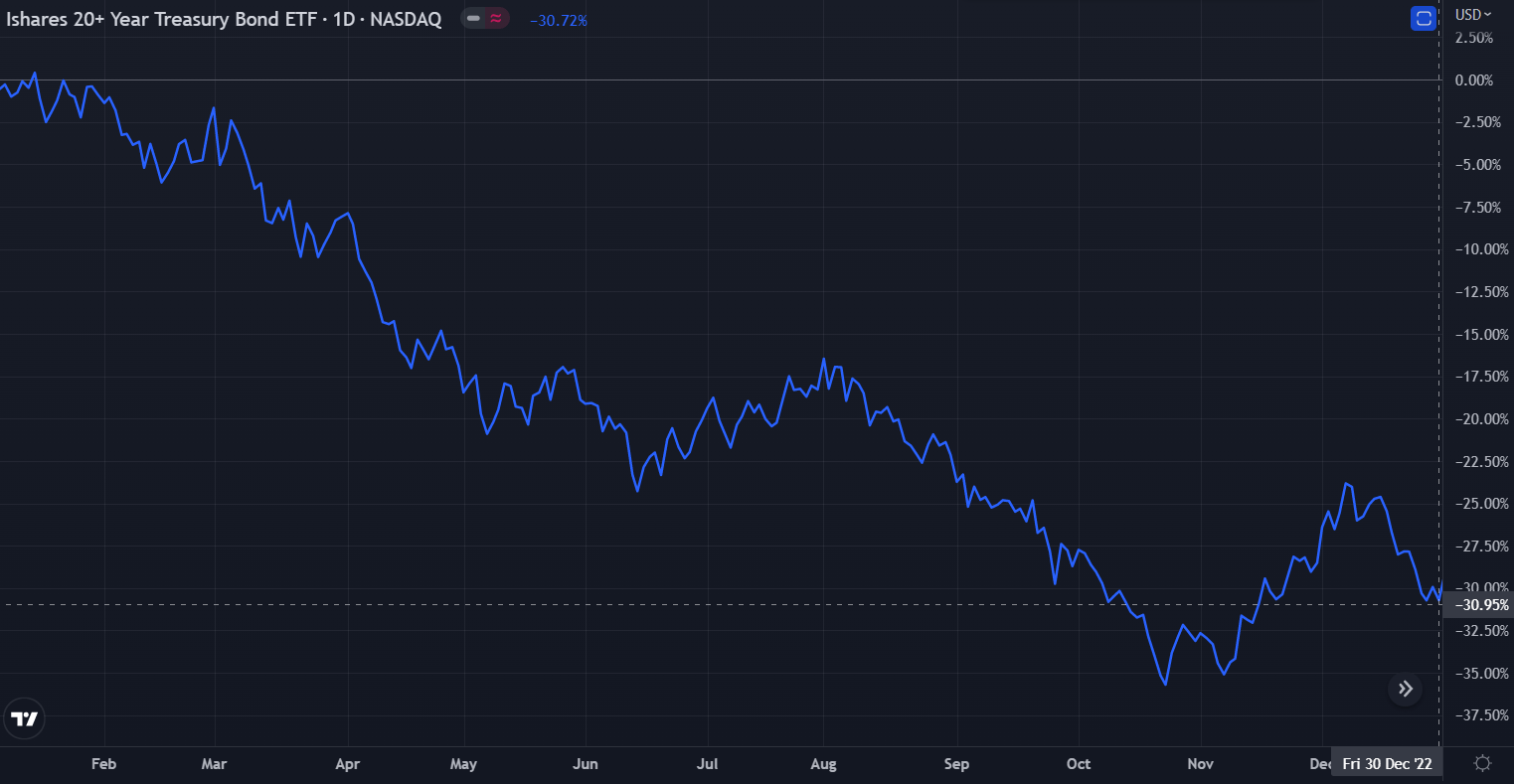 US bonds and cryptocurrencies were crushed in compassion to US equities. The iShares 20+ Year Treasury Bond ETF ($TLT) had its worst year in the history of the ETF. Shares lost 30.72% of their value, fueled by the FED raising interest rates to combat inflation.