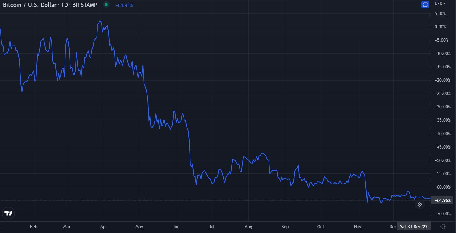 Bitcoin ($BTC) also experienced a disappointing year in 2022, falling 64.41%. Bitcoin is seen as the “most stable” cryptocurrency and this rings true when you compare its 2022 performance in some of its small market-cap counterparts.