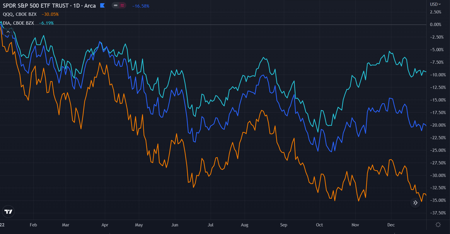 (2022 performance of $SPY, $QQQ and $DIA)